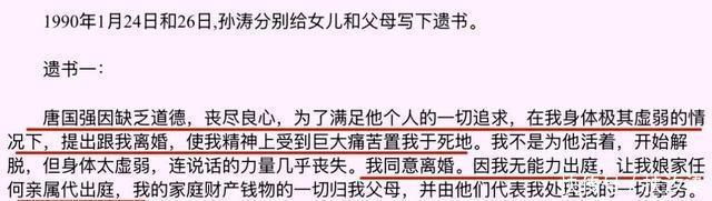 除夕夜的遗书 1990年1月26日,唐国强的原配妻子孙涛,在这一天选择了自我了断。孙涛死的时候还留下两封遗书,遗书孙涛把唐国强的无情无义揭露了出来。 孙涛指责唐国强在自己身体虚弱的情况的下,和自己提出离婚。孙涛说自己因身体原因无力出庭,所以只能被迫同意离婚。