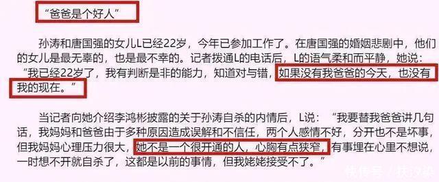唐国强的孩子 孙涛自杀后,唐国强也被八一厂赶了出来;当时很多导演不再找他拍戏,唐国强那段时间非常惨,为了赚钱养家唐国强做了很多很多。 唐国强的女儿莉莉长大之后,也开始为自己的父亲解释;当年唐国强和孙涛因为各种原因,造成了两人的误会,在相互误解的前提下,两人的感情越来越差。