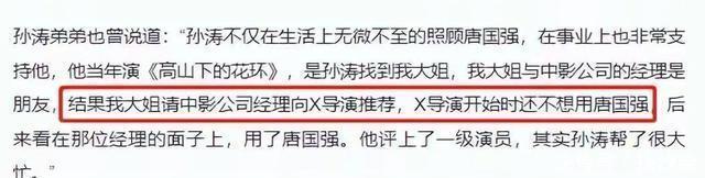 孙涛的弟弟孙杰也向媒体爆料,在唐国强当年饰演《高山下的花环》时,姐姐孙涛曾找大姐帮忙说过情;大姐和某影视公司的经理是朋友,孙涛让大姐找这位朋友推荐一下唐国强;那位经理找导演提了一下这事,于是唐国强便当上了这部电影的男主。