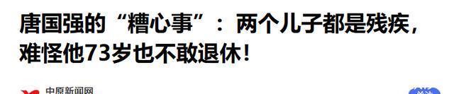 唐国强的大儿子出生后,被诊断为先天性视力残疾,视力只有0.1;为了给孩子治病,唐国强带孩子跑了不少地方,可惜最后的结果并不如意。 二儿子出生后,身体疑似也有问题,唐国强让妻子壮丽带着二儿子在美国接受治疗并读书。为了给孩子赚医药费,唐国强七十多了还在继续拍电视。