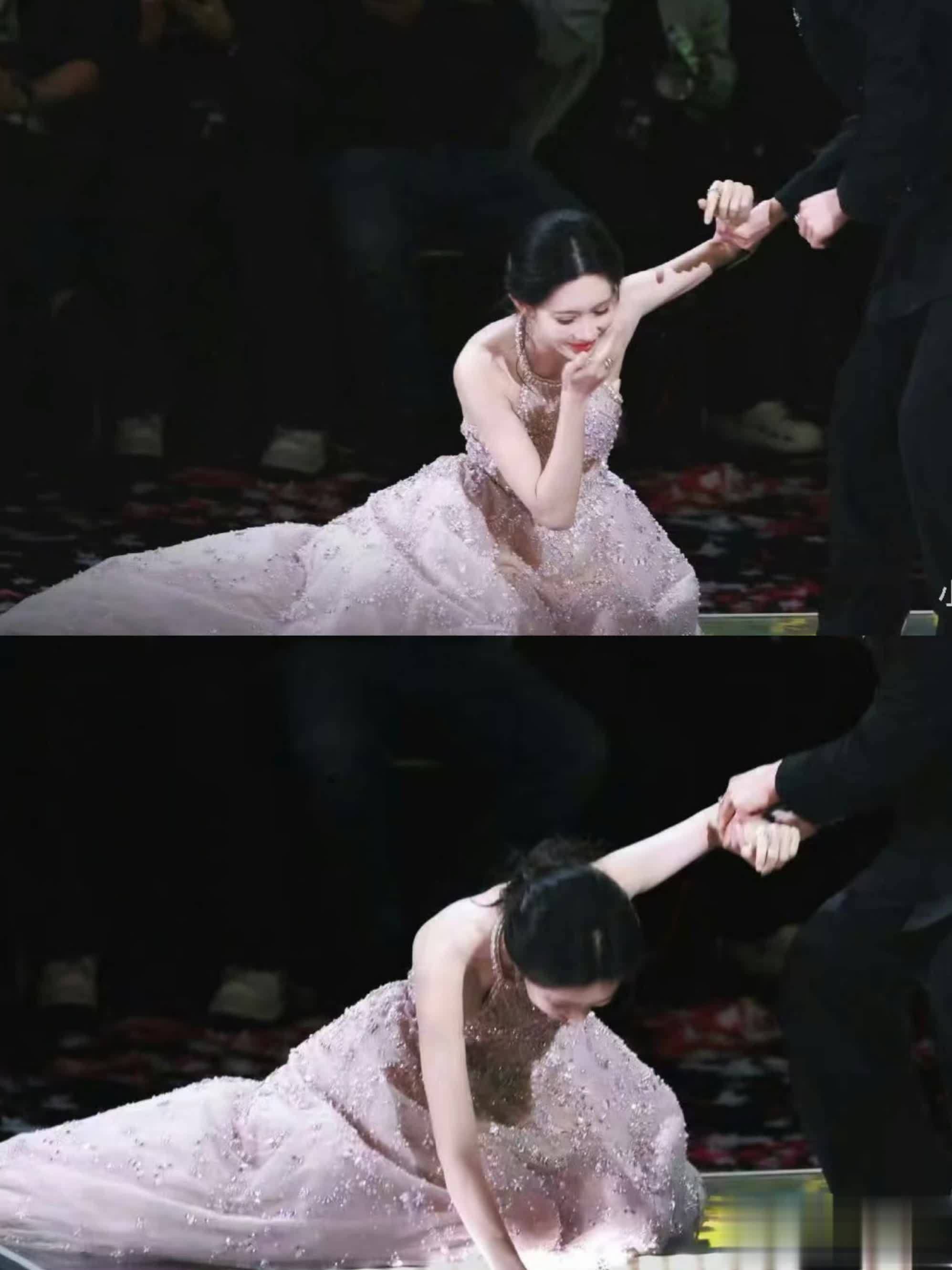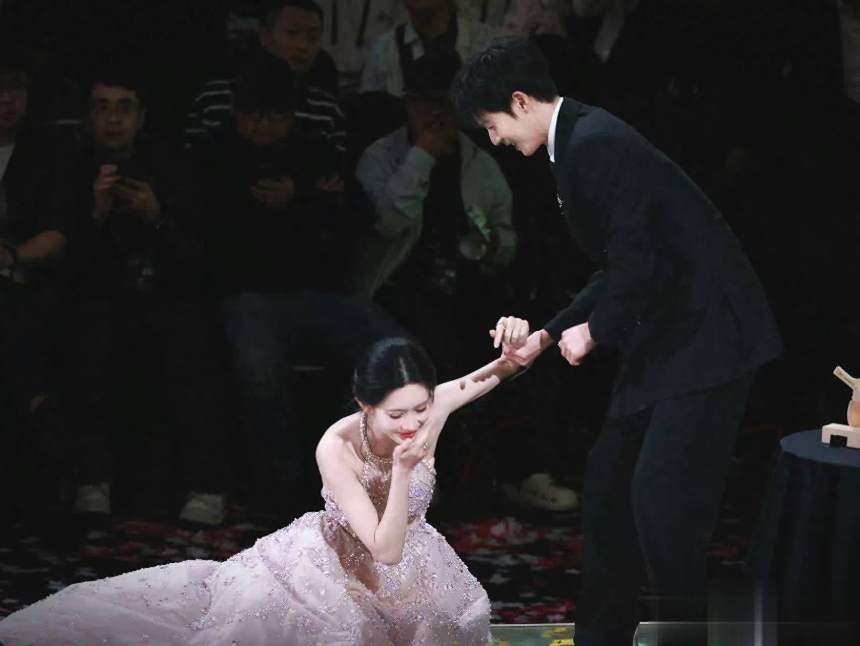 现场,李昀锐秒速俯身搀扶,虽未完全阻止摔倒,但下台时紧盯台阶、主动提裙摆,尽显暖心;